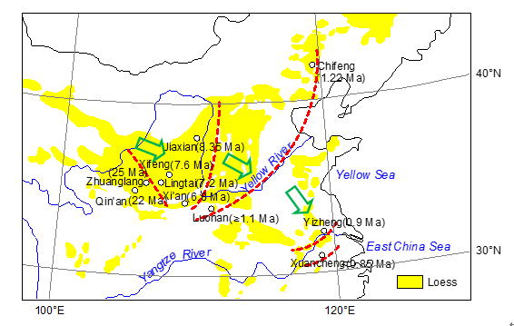 图2 中国风尘堆积底界年代的空间变化所指示的亚洲干旱化区域阶段性扩张
